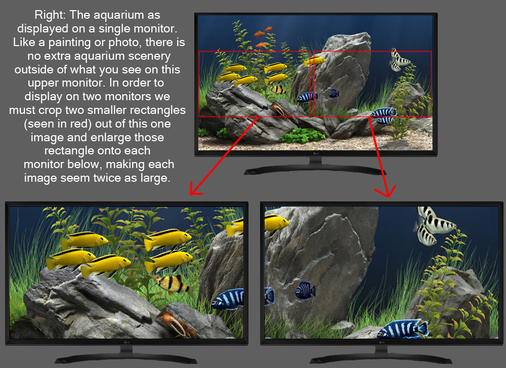The scenery in Dream Aquarium 1 was designed to fit the dimensions of a standard high-definition TV. This creates a zoom artifact when trying to display across multiple monitors. Putting TWO HD monitors side-by-side effectively doubles the width of your display while keeping the height the same. This creates a radically different-shaped 'window' into the existing aquarium image - one which is extremely wide and not very tall. Dream Aquarium is forced to 'crop' into the existing image to make it fit onto the double-wide window which two side-by-side monitors create. The following image helps to visualize what is going on: